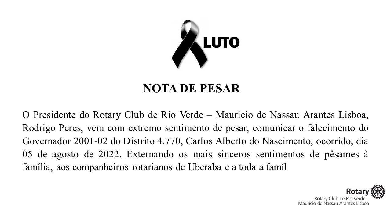 O Presidente Rotary Club de Rio Verde – Mauricio de Nassau Arantes Lisboa, Rodrigo Peres, vem com extremo sentimento de pesar, comunicar o falecimento do Governador 2001-02 do Distrito 4.770, Carlos Alberto do Nascimento, ocorrido hoje, dia 05 de agosto de 2022. Externando os mais sinceros sentimentos de pêsames à família, aos companheiros rotarianos de Uberaba e a toda a família rotária.
