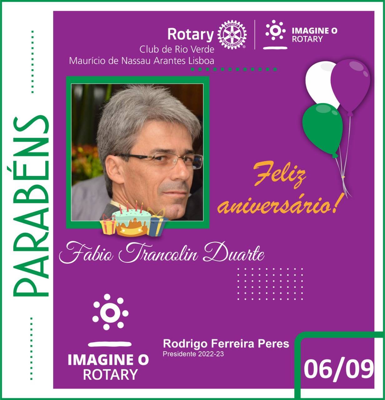 Os membros do Rotary Club de Rio Verde – Mauricio de Nassau Arantes Lisboa, parabenizam o associado Fábio Trancolin pelo seu aniversário! Parabéns companheiro pelo teu dia... Muitas felicidades... Feliz aniversário...
