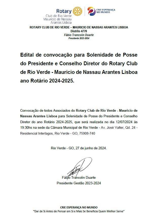 Edital de convocação para Solenidade de Posse do Presidente e Conselho Diretor do Rotary Club de Rio Verde - Mauricio de Nassau Arantes Lisboa ano Rotário 2024-2025.