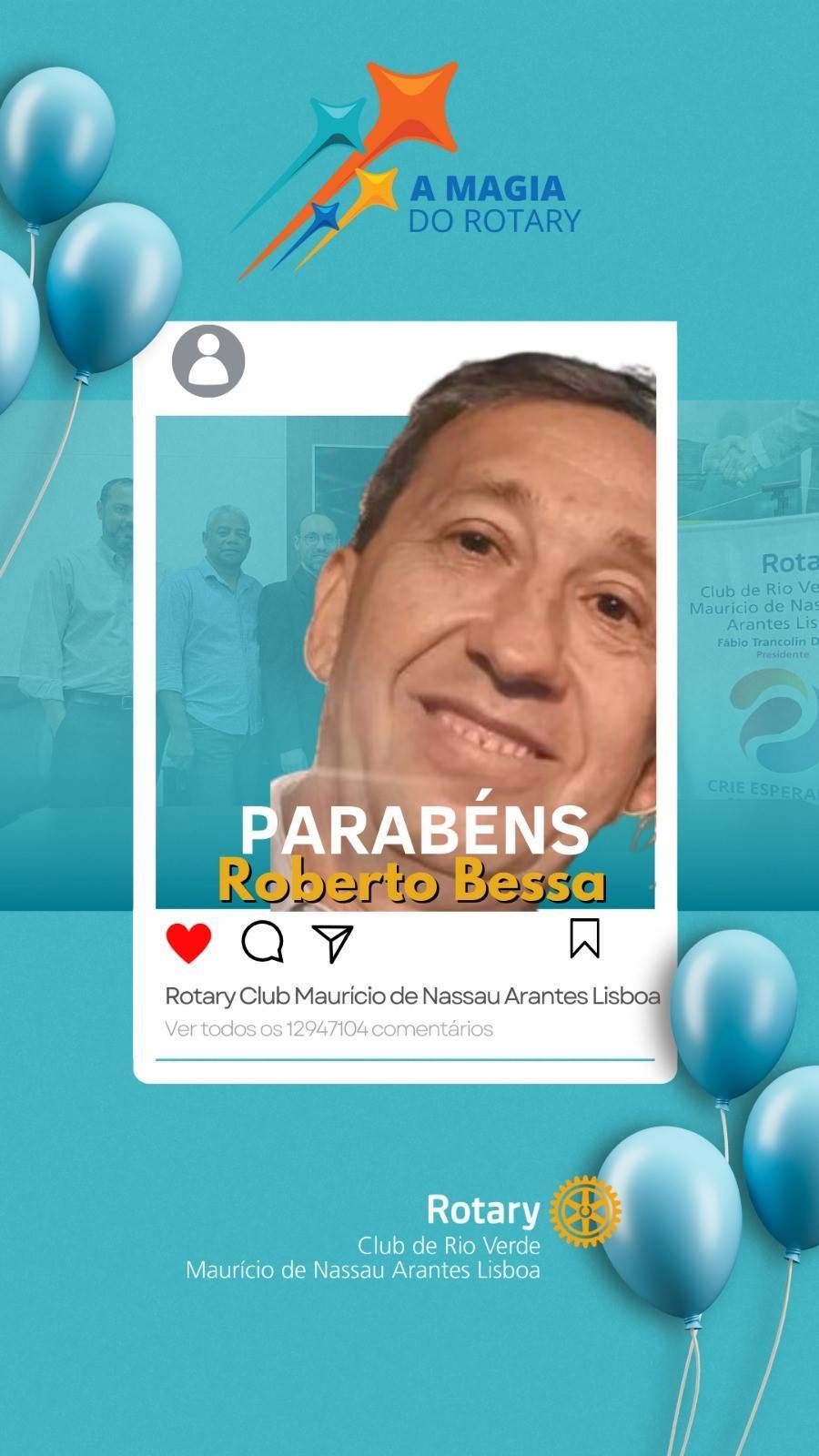 Hoje, celebramos o aniversário do nosso companheiro Roberto Bessa! Em nome de todos os membros do Rotary Club Mauricio de Nassau Arantes Lisboa, expressamos nossos votos mais sinceros de felicidade, saúde e realizações neste novo ciclo. Sua dedicação ao serviço humanitário é um exemplo inspirador para nós todos. Que sua jornada seja repleta de momentos memoráveis, conquistas significativas e alegria. Conte sempre com nosso apoio e amizade. Feliz aniversário Roberto!