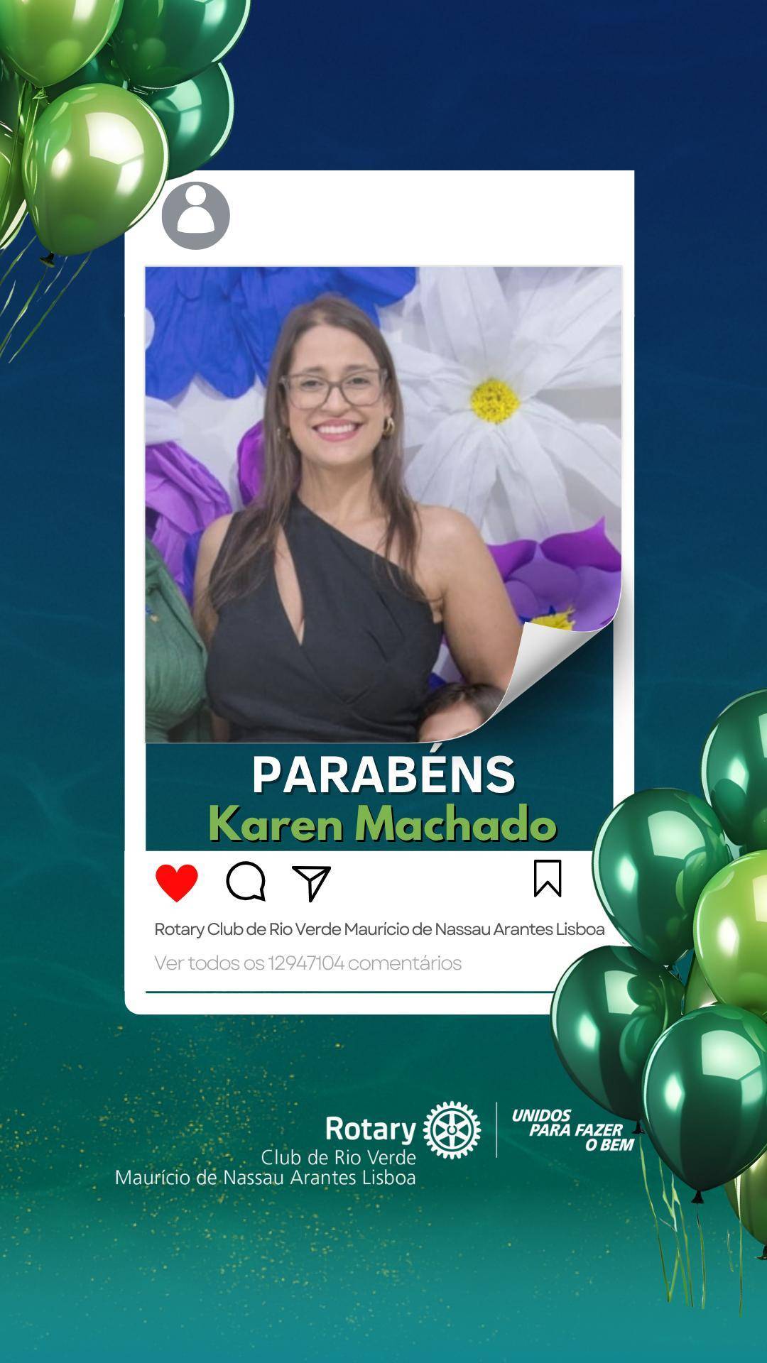 O Rotary Club Maurício de Nassau Arantes Lisboa felicita a companheira Karen Machado pelo seu aniversário, celebrado neste dia 10 de outubro. Desejamos-lhe muita saúde, felicidades e sucesso em sua caminhada rotária e pessoal.