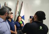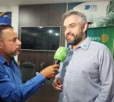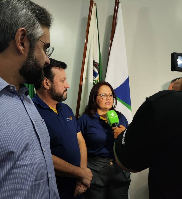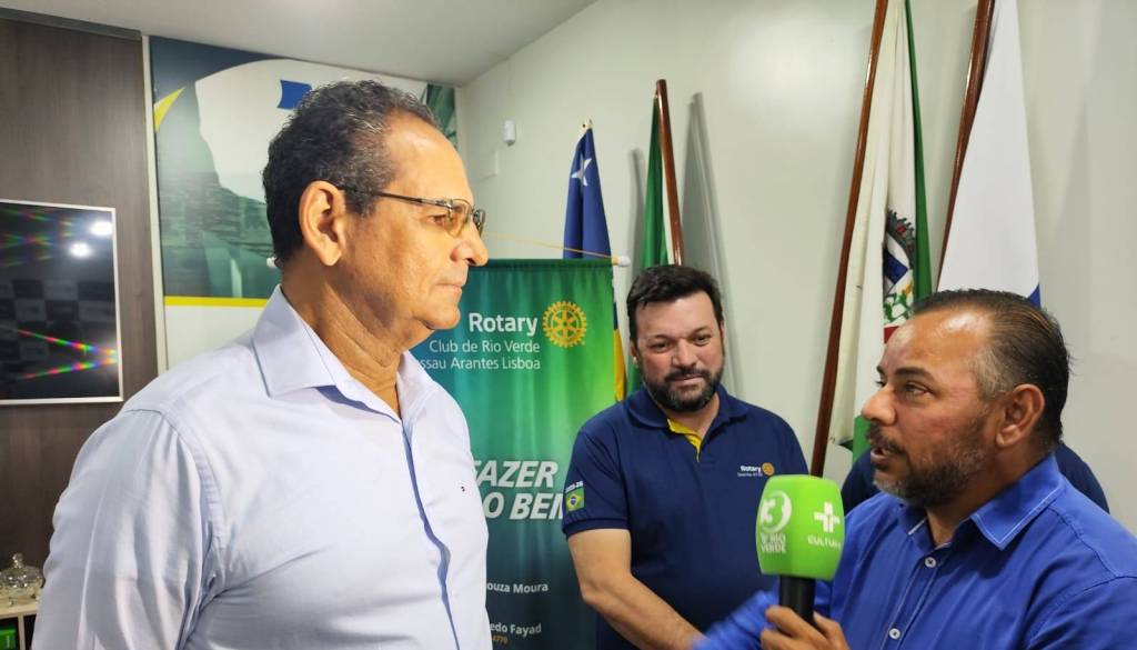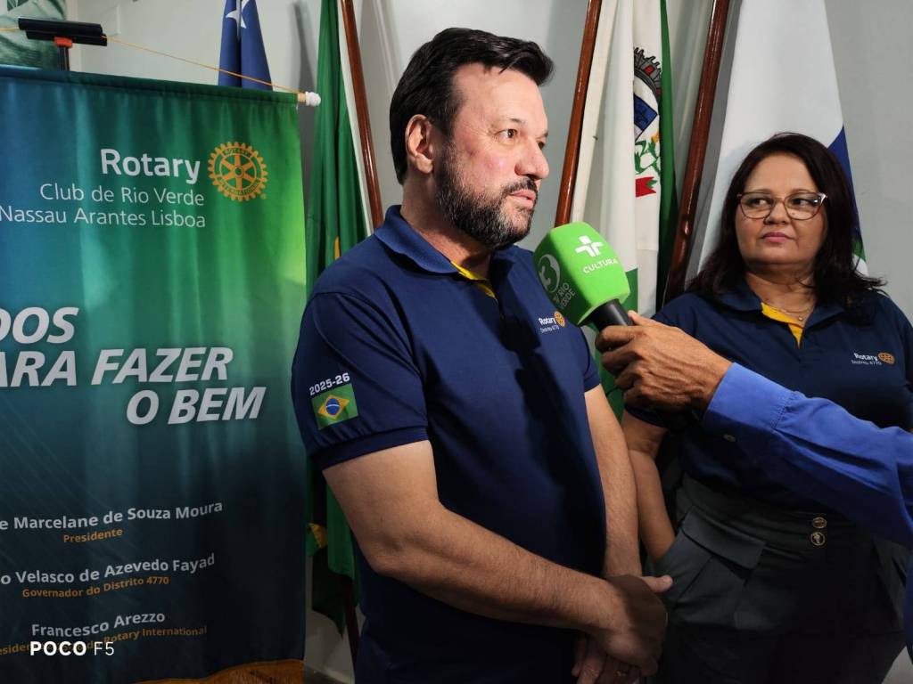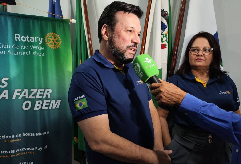 Durante a visita, o governador concedeu entrevista à equipe da TV Rio Verde, conduzida pelo repórter Júnior Pimenta, destacando as iniciativas rotárias e a importância do engajamento da comunidade local.