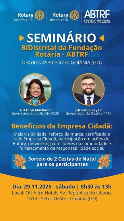 No último dia 29 de novembro, sábado, a presidente do Rotary Club Maurício de Nassau Arantes Lisboa, Denise Moura, participou em Goiânia do Seminário Bi-Distrital da Fundação Rotária – ABTRF, reunindo os distritos 4530 e 4770. O encontro foi realizado no Oft Alfre Hotels e contou com a presença de importantes lideranças rotárias.