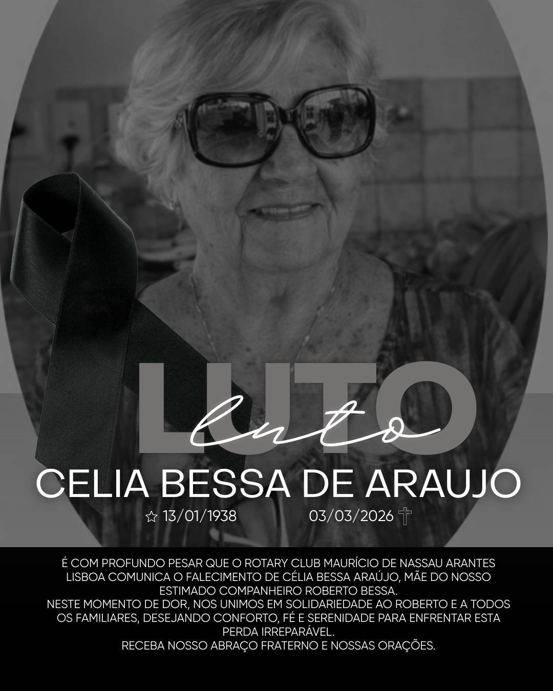 O Rotary Club – Maurício de Nassau Arantes Lisboa lamenta, com profundo pesar, o falecimento da mãe do companheiro Roberto Bessa