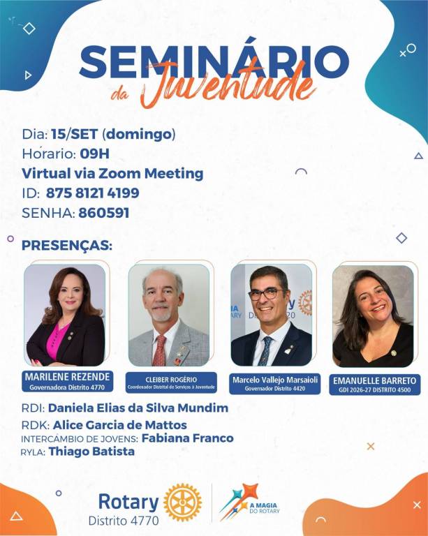 Convidamos toda a família rotária do Distrito 4770 para participar do nosso Seminário da Juventude, que será realizado virtualmente no dia 15 de setembro, às 9 horas da manhã. Contaremos com grandes palestrantes que trarão temas essenciais para o desenvolvimento da juventude e o fortalecimento dos nossos clubes.