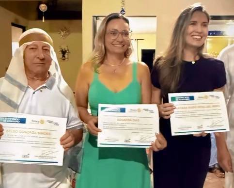 Um dos momentos mais significativos da noite foi a posse de três novos associados: Celso Simões, Eduarda Dias e Nayara Rubio, reforçando o crescimento do clube e a ampliação da rede de pessoas comprometidas com o serviço e com as causas humanitárias apoiadas pelo Rotary.