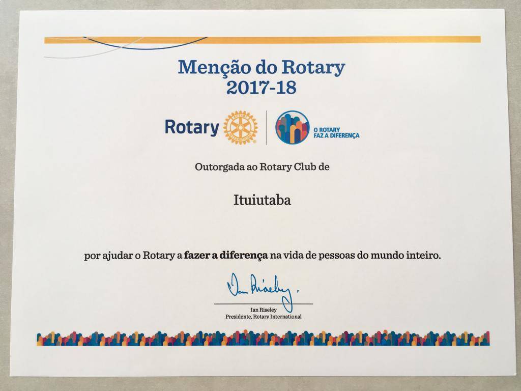 Com muita satisfação o Rotary Club de Ituiutaba recebeu a Menção do Rotary e a Menção da Fundação Rotária pelo cumprimento das metas na gestão 2017-2018.